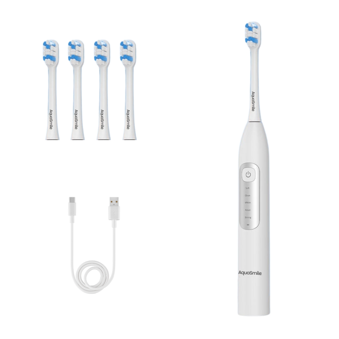 Viene con 4 cabezales con cerdas DuPont importadas de USA, suaves y duraderas, y un cable de carga USB-C. Todo listo para cuidar tu sonrisa desde el primer día.